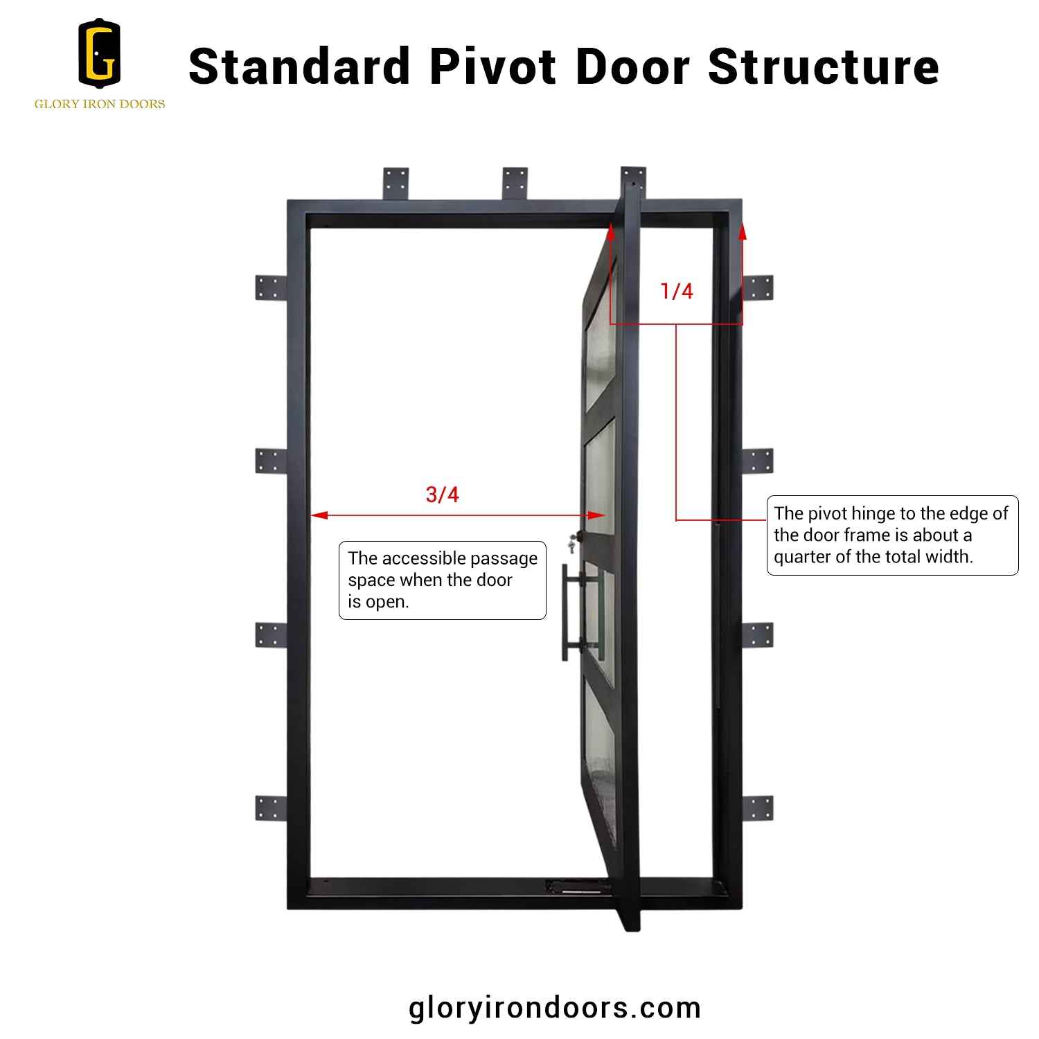 A standard pivot door is engineered with the pivot hinge positioned approximately one-quarter of the door width from the edge. This design allows about three-quarters of the total door width to function as the clear, accessible passage when the door is open. It ensures smooth operation, proper weight balance, and a clean, modern architectural look- ideal for custom iron pivot doors.