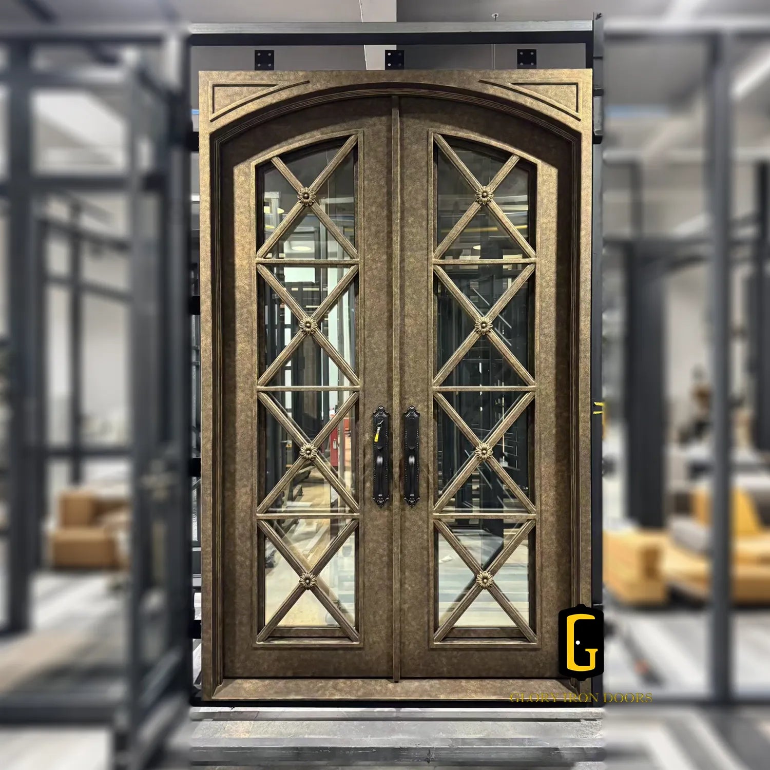 GID Double Iron Front Door with Arched Top Tempered Glass ED175