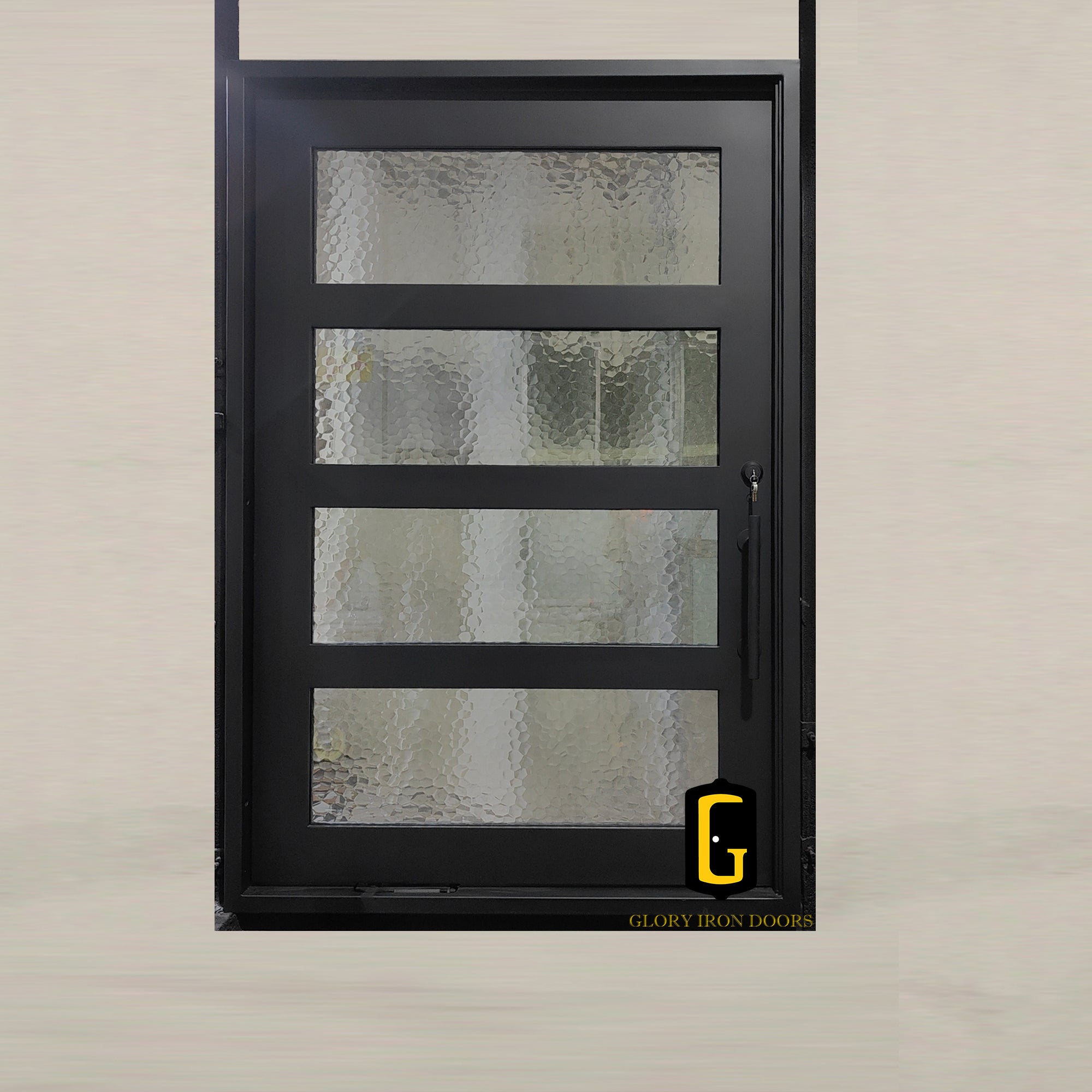 Features vertical water-like lines that deliver excellent privacy with a modern look. Highly popular for iron doors due to its balance of light, style, and protection.